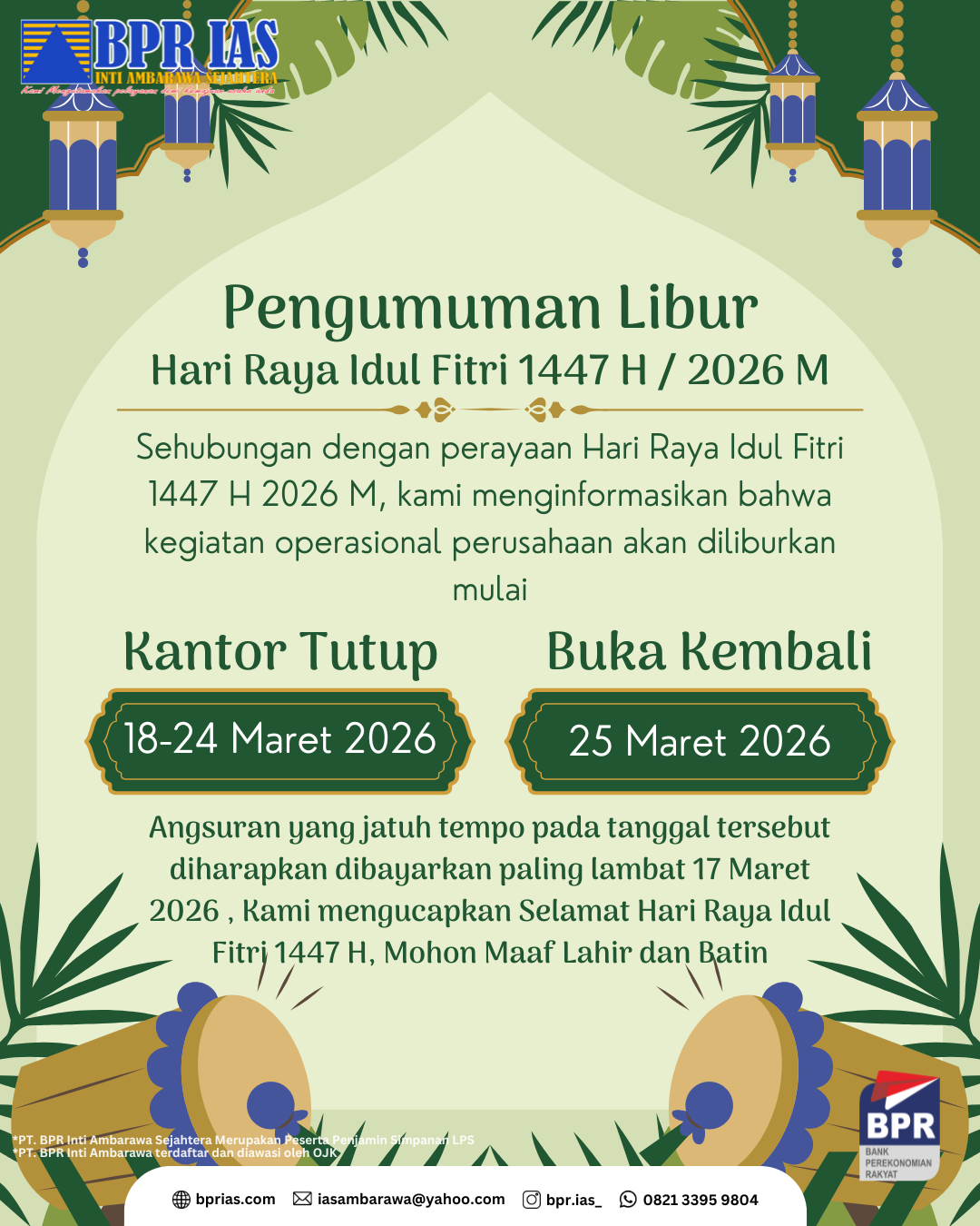 PENGUNUMAN LIBUR HARI RAYA IDUL FITRI 1447 H intii Senin, 2026-03-02 Segenap jajaran Komisaris, Direksi & Staff BPR Inti Ambarawa Me